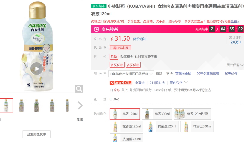 (7)小林制药内裤专用洗衣液 原价28元。京东价31.5元。内购价21.9元