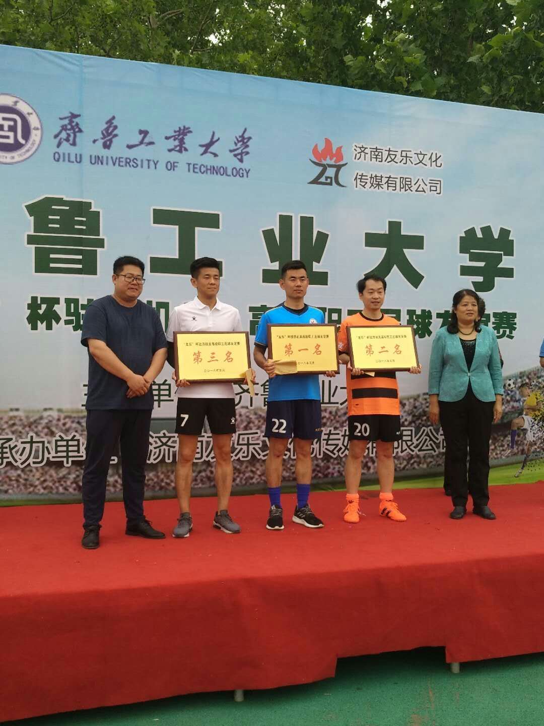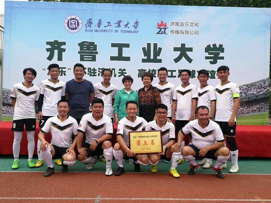 5月6日-19日,由友乐文化传媒有限公司承办的友乐杯驻济机关、高校教职工足球赛在齐鲁工业大学举行。本次比赛共有机关、医院和驻济高校的8支球队参加,学校教工男子足球队应邀参加了比赛。在小组赛中,学校 教工男子足球队表现了不俗的实力,以两胜一平的成绩晋级排名赛。随后,在季军争夺战中,学校教工男子足球队发挥更加出色,以6:2力克山东管理学院足球队,最终以三胜一平的不败战绩获得第三名。
